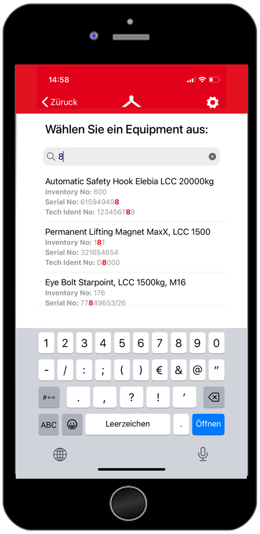 In der Volltextsuche im Reiter “Equipments” kann nach dem Namen, der technischen Identifitkationsnummer, Serialnummer und Inventarnummer des Equipments/Produktes gesucht werden.