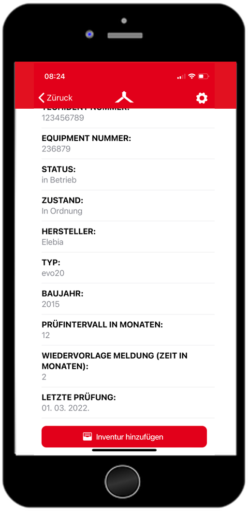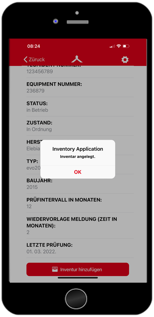 Um eine Inventur anzulegen, wählen Sie ein Equipment aus. Dies ist entweder über die technischen Plätze, die Scanfunktion oder über die Equipment Liste möglich. Anschließend öffnen sich die Equipment-Details. Mit Scrollen nach unten erscheint der rote Button “Inventur hinzufügen”, mit dem dieses Equipment der Inventurliste hinzugefügt wird. Diese Inventurliste, kann über das Betriebsmittelportal über den Reiter “Inventur” eingesehen und verändert werden. Nach erfolgreichem hinzufügen, erscheint eine Hinweismeldung, “Inventar angelegt”.