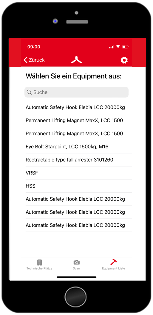 Über den Reiter „Scan“ gelangt man zur Verknüpfung der Kamera des mobilen Endgerätes. Hiermit kann ein Barcode erfasst werden, welcher zu einem hinterlegten Equipment führt. Dadurch wird nach der technischen Identifikationsnummer bei den Equipments gesucht und das Equipment mit der übereinstimmenden Nummer wird angezeigt. Außerdem können externe Lesegeräte gekoppelt werden, um z. B. RFID-Tags auszulesen.