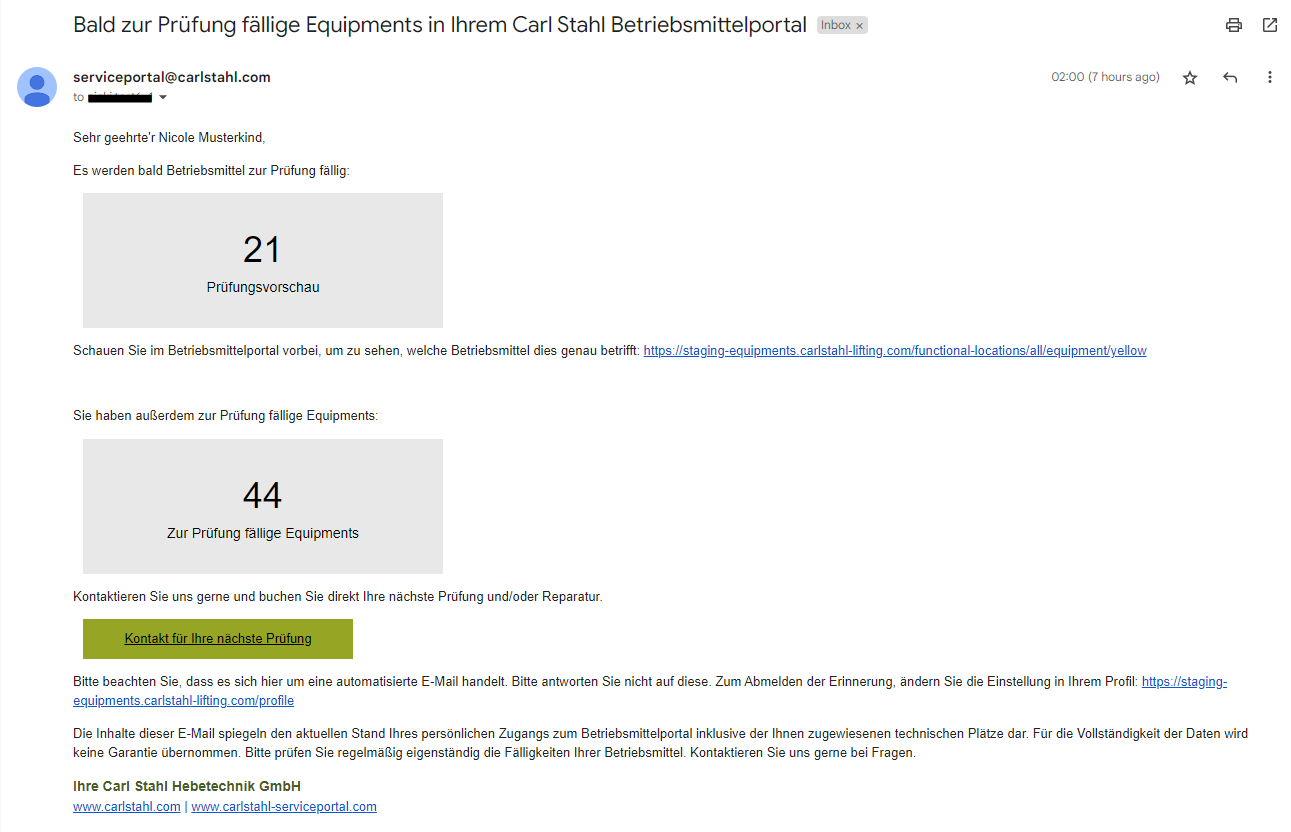 In der E-Mail zur Prüferinnerung werden Nutzer darauf hingewiesen, dass Sie überfällige oder bald fällige Equipments auf den Ihnen zugewiesenen technischen Plätzen haben.