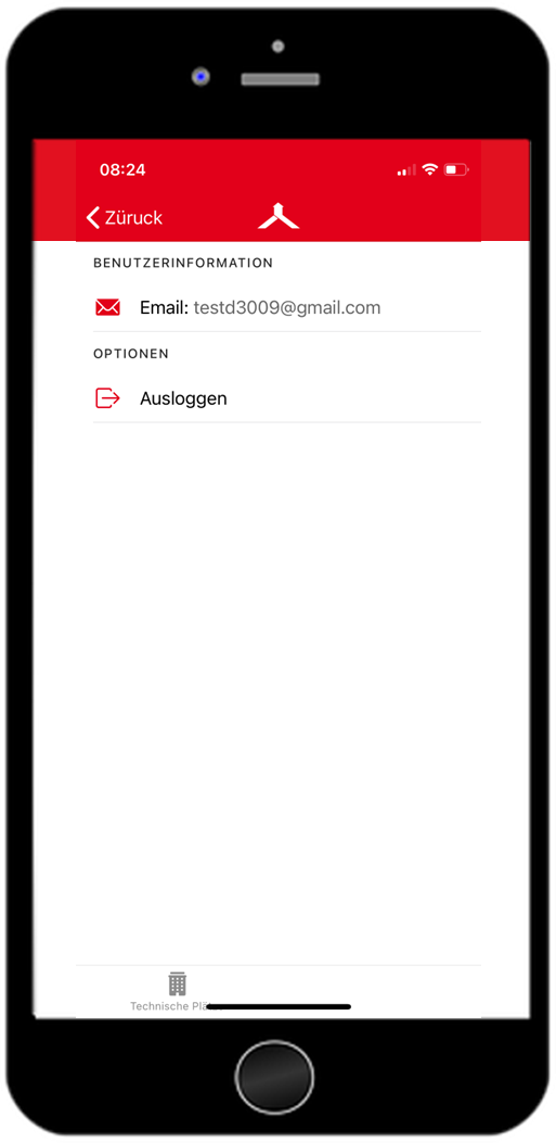 Über die Einstellungen (Zahnrad Icon oben rechts) kann die E-Mail-Adresse des Benutzers eingesehen werden und zugleich aus der App abgemeldet werden, Button “Ausloggen”.