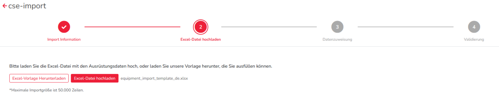 Hier bitte entweder die Vorlage downloaden und befüllt hochladen oder die eigene Exceldatei hochladen. Maximalgröße der Datei sind 50.000 Zeilen. Es wird lediglich der erste Reiter berücksichtigt (Tabellenblatt 1). Die Überschriften müssen in der ersten Zeile sein. Heißt es werden die Equipments ab der Zeile 2 berücksichtigt und importiert.