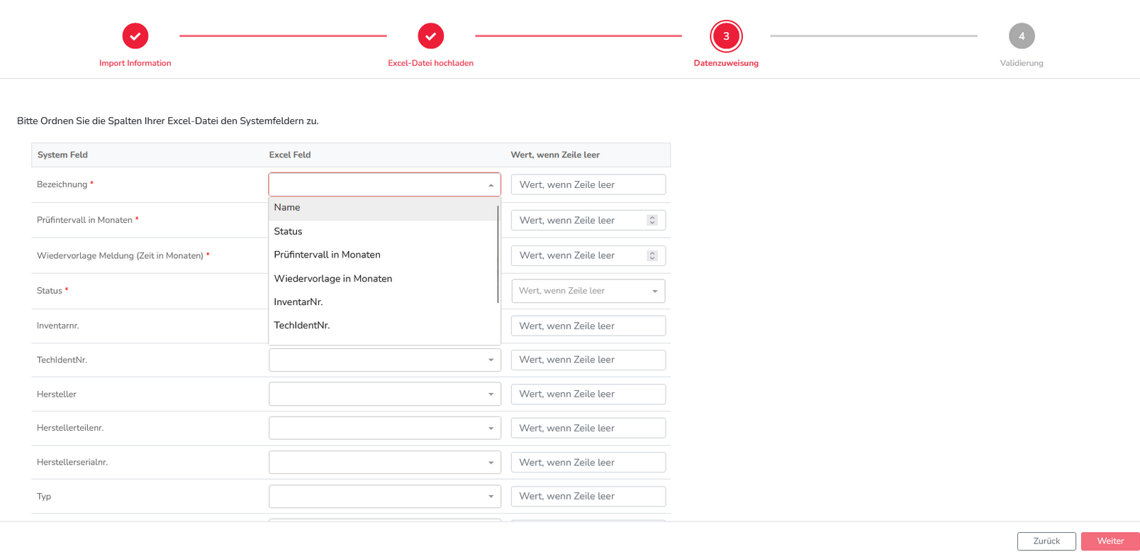 In Schritt 3 müssen die Excelfelder (Überschriften aus Zeile 1) den Systemfeldern hinzugefügt werden. Die Reihenfolge des Dropdowns ist die Reihenfolge der Überschriften von links nach rechts.