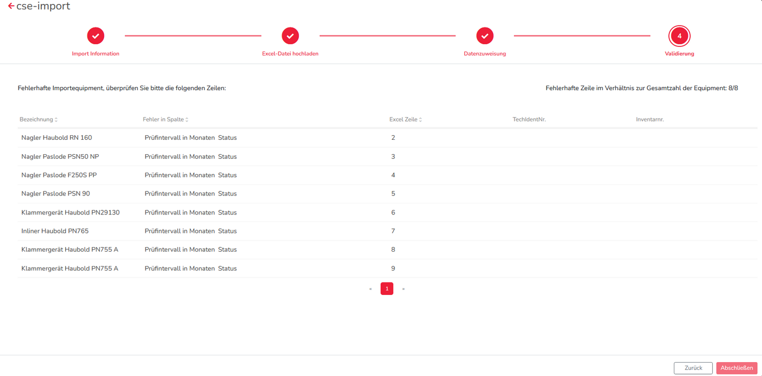 In der Listenübersicht werden NUR die Equipments angezeigt, bei denen im Import ein Fehler aufgetreten ist. Der Fehler wird in der Spalte “Fehler in Spalte” angezeigt. Dort liegt entweder ein falsches Format, eine falsche Eintragung oder eine falsche Zuweisung vor, wie in dem Beispiel im Screenshot.