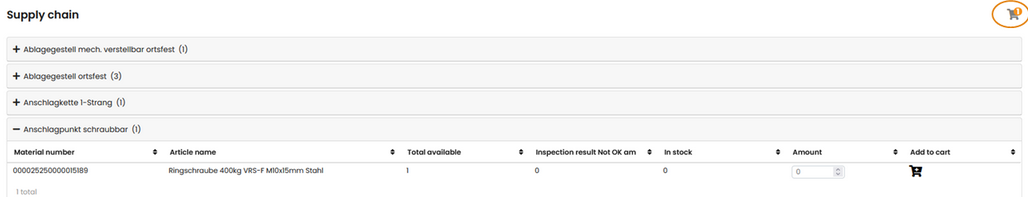 Mit Klick auf die Objektart öffnen sich die darunter verknüpften Artikel/Materialnummern, die jeweils ein Equipment verbunden haben. Dh. zu diesen Webshop Artikeln besitzen Sie Equipments. Tragen Sie nun zum gewünschten Artikel rechts in der Spalte "Amount" die Anzahl ein, wie oft Sie den Artikel bestellen möchten.