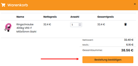 Über den Button "Bestellung bestätigen" können Sie die Bestellung aufgeben. Anschließend wird die Bestellung in das Warenwirtschaftssystem bei Carl Stahl übertragen. Mit Aufgabe der Bestellung stimmen Sie den AGB des Webshops zu.