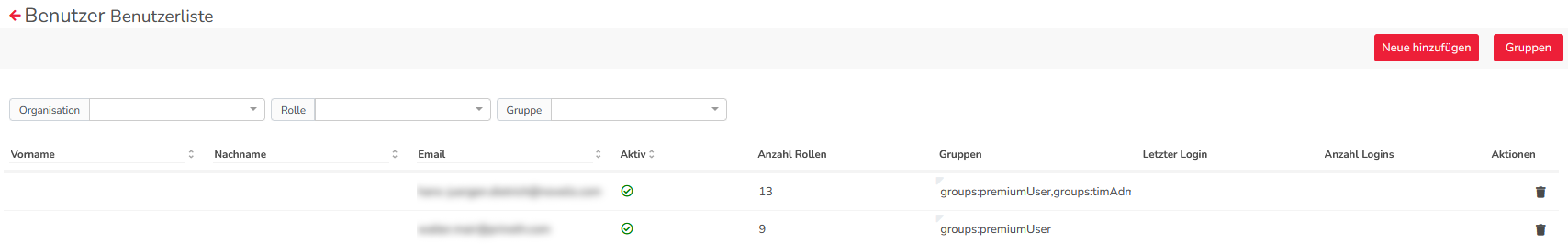 Wählen Sie auf der linken Seite den Menüpunkt Benutzer aus. Prüfen Sie zunächst, ob Ihr Nutzer bereits in der Vergangenheit angelegt wurde und daher schon im Backend aufgelistet wird. Sie können über die Spalten in der Tabelle nach Vorname, Name oder E-Mail Adresse suchen. Gibt es keinen Treffer können Sie zum nächsten Prozessschritt "Neuen Benutzer anlegen" übergehen.