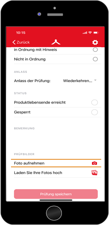 Bei einer Prüfung über die Inspection App können ein oder mehrere Prüfbilder hinzugefügt werden. Diese werden zukünftig (aktuell noch in Umsetzung) auch dem Prüfzertifikat angehängt. Sie können auswählen, ob Sie das Foto direkt machen möchten “Foto aufnehmen” oder ob Sie ein bereits erstelltes Foto der Prüfung hinzufügen möchten “Laden Sie Ihre Fotos hoch”.