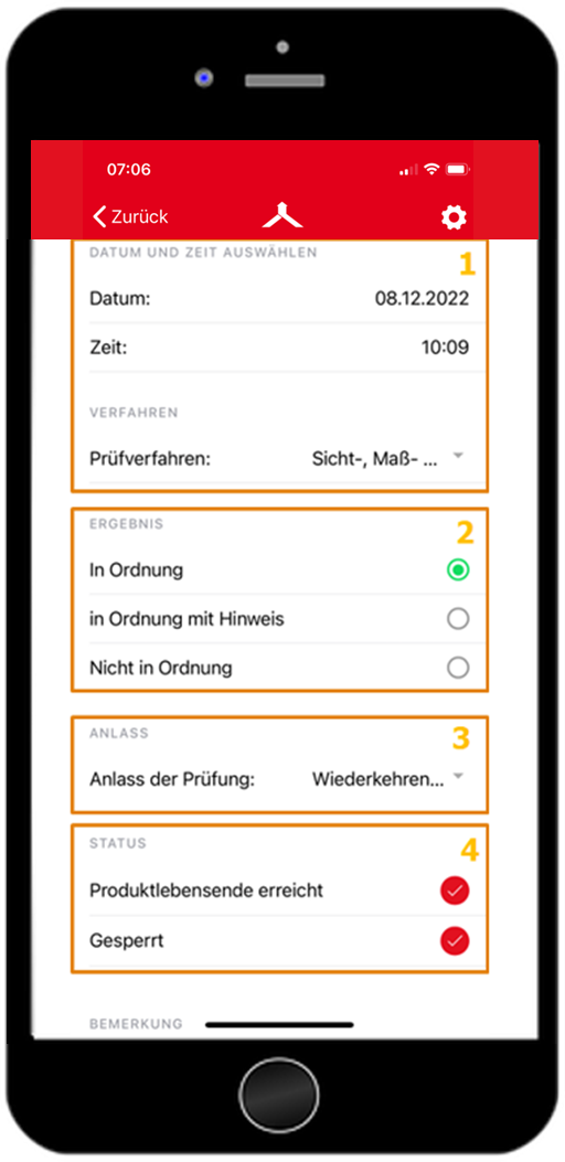 - Wiederkehrende SicherheitsprüfungStatus: Hier können Sie den Status des geprüften Equipments mit Abschluss der Prüfung ändern.