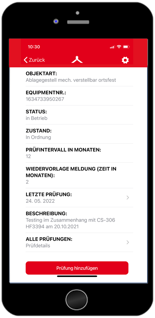Um eine Prüfung durchzuführen wählen Sie ein Equipment aus, scrollen runter und klicken anschließend auf den roten Button “Prüfung hinzufügen”, siehe linker Screenshot.